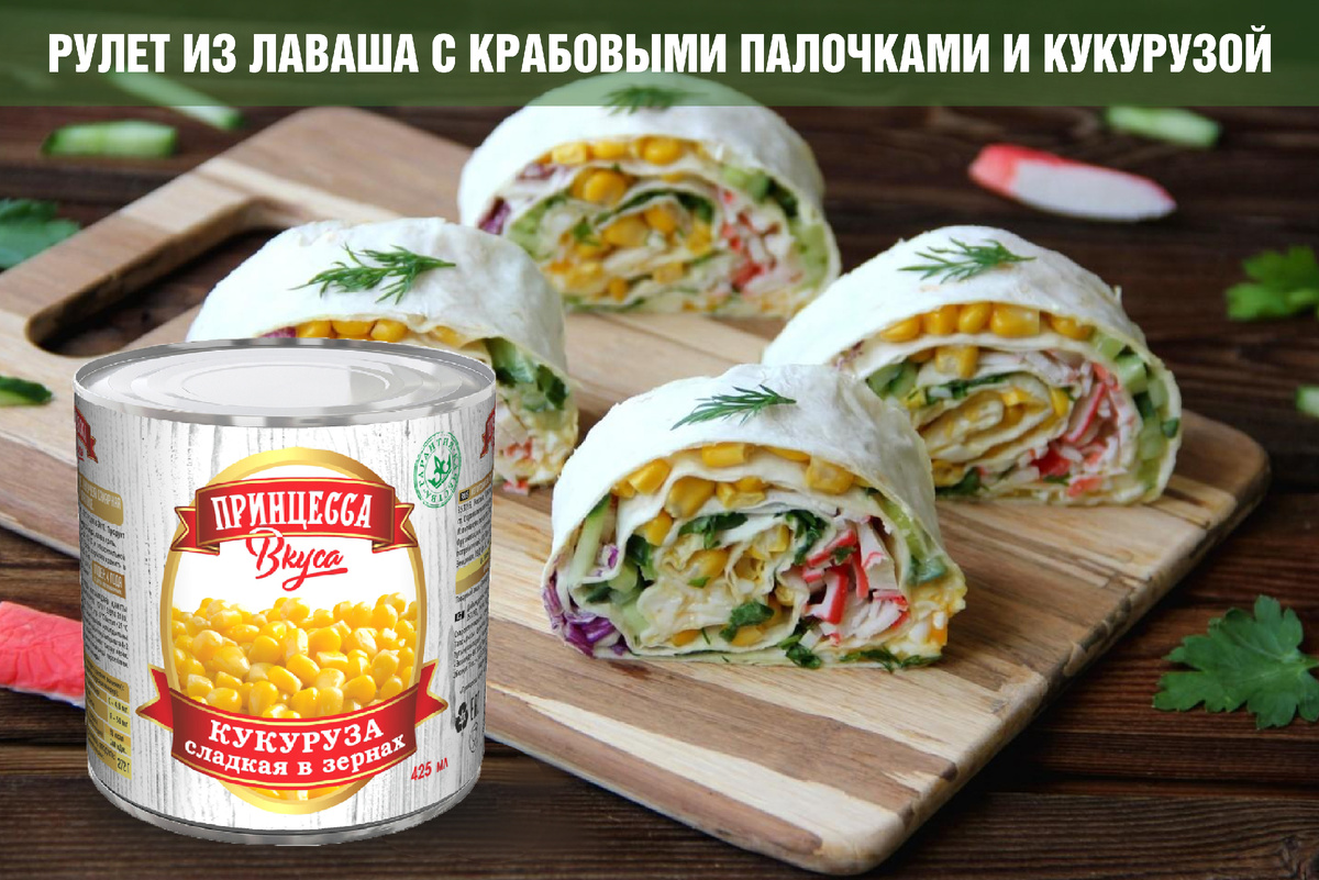 4. Лист лаваша разверните и смажьте майонезом. Выложите подготовленные продукты полосками в такой последовательности: - кукуруза, яйца, зелень, кукуруза, огурец, кукуруза, крабовые палочки, зелень, пекинская капуста, кукуруза, огурец, яйца. От первой полоски кукурузы оставьте лаваш свободным на ширину полосок, для удобства сворачивания.