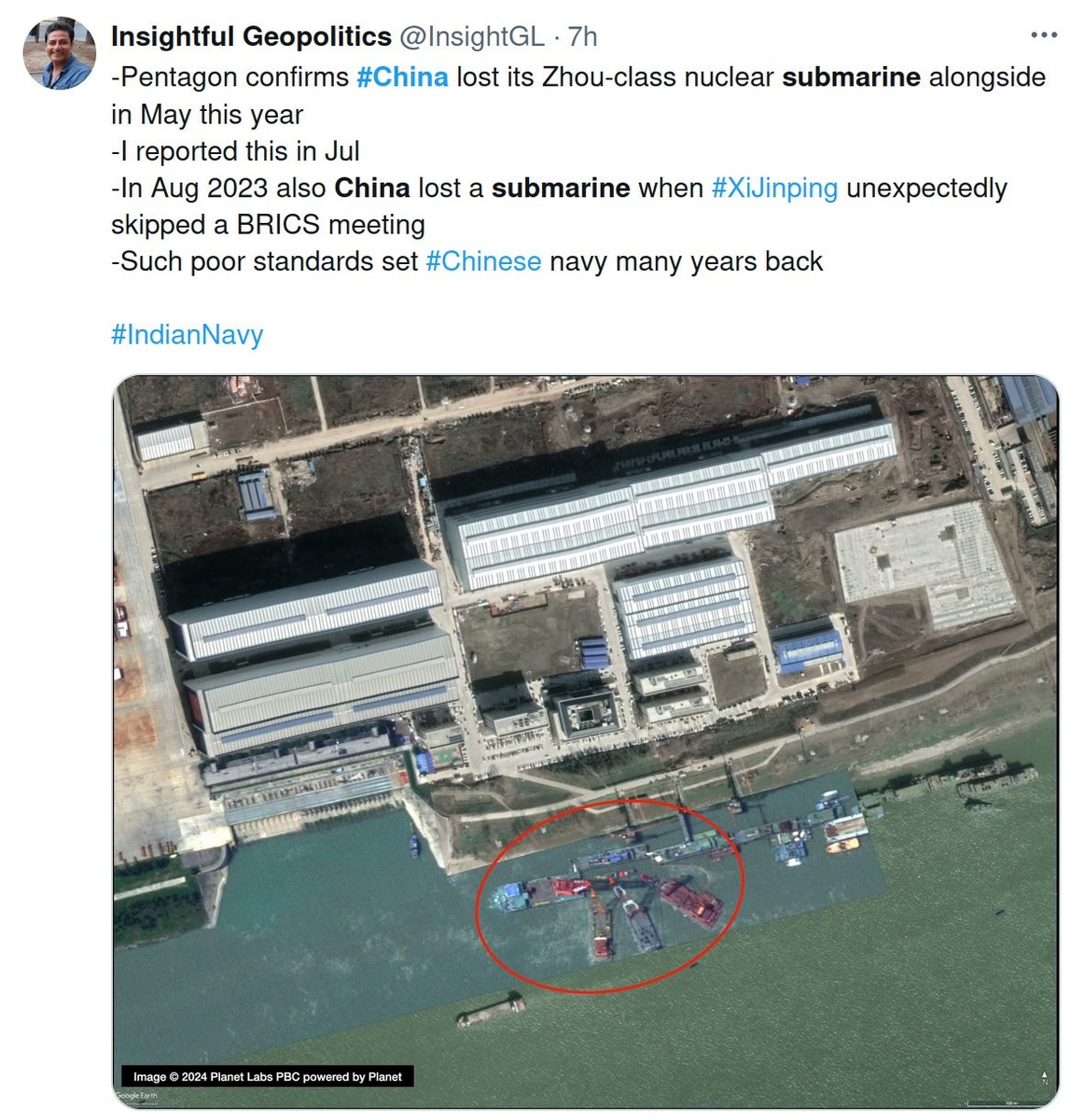 Сегодня ночью (в Америке соответственно - вчера днём) в заокеанских СМИ появилась информация о затонувшей в Янцзы китайской атомной подводной лодке. Сообщалось, что власти КНР пытались скрыть данный факт, но вездесущие американские спутники в симбиозе с американскими же журналистами не позволили им этого сделать. Посыл этой новости абсолютно понятен - ой-ой-ой, какая беда-то в Китае произошла! Ай-ай-ай - если там такие беды происходят, то не такая уж и передовая эта держава. Не то что Америка! Кстати, в российских СМИ эта новость тоже появилась. Ну что поделать, любят наши журналисты всякие Вашингтон Пост, Рейтер и прочие бибиси цитировать. Но на беду американцев нашлись те, кто не поверил, и даже подвергнул сомнению версию происшедшего. В частности это сделал Руслан Карманов в своём ТГ-канале "Китайский связной", рассказав, что такие утопления китайской подлодки случаются регулярно раз в 1,5-2 года, как только американцам надо замылить какую-то неприятную для себя новость касающуюся