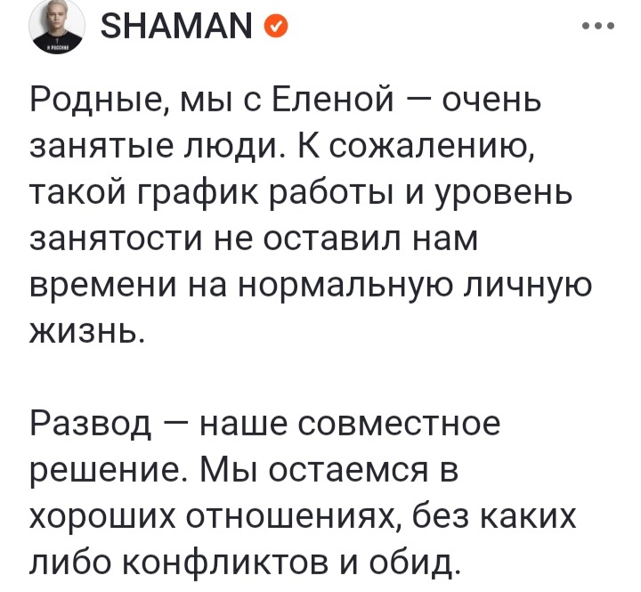 Думаю, уже многим известно, что звездная пара SHAMAN (Ярослав Дронов) и его жена Елена Мартынова расстались. Вот как об этом объявил сам певец: