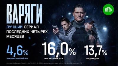 Остросюжетный проект обогнал сериал телеканала «Россия 1» «Дама с собачкой 2» с рейтингом 4,1%, сериал «Первого канала» «Два берега» с рейтингом 3,3%, сериал «Пятого канала» «След» с рейтингом 3,3% и «Солнце, море, два ствола» на телеканале СТС с рейтингом 2,7%. Средняя доля показа сериала «Варяги» составила 13,7%, максимальная — 16%. «Варяги» — остросюжетный детектив, повествующий о московских полицейских Малахове, Груздеве и Шадрине, которые приезжают в небольшой коррумпированный городок Горовец, чтобы возглавить местное ОВД и навести в нем порядок. Совсем недавно в Горовце произошло ЧП: была арестована половина руководящего состава ОВД. А произошло это из-за крупнейшего в городе легального бизнеса — цементного завода: он процветал, обороты росли, тем самым предприятие стало лакомым куском для всех, и борьба за него вышла на федеральный уровень. Горовецкие коллеги совсем не рады приезду нового начальства: они устраивают им более чем холодный прием и тут же дают прозвище — варяги! Да