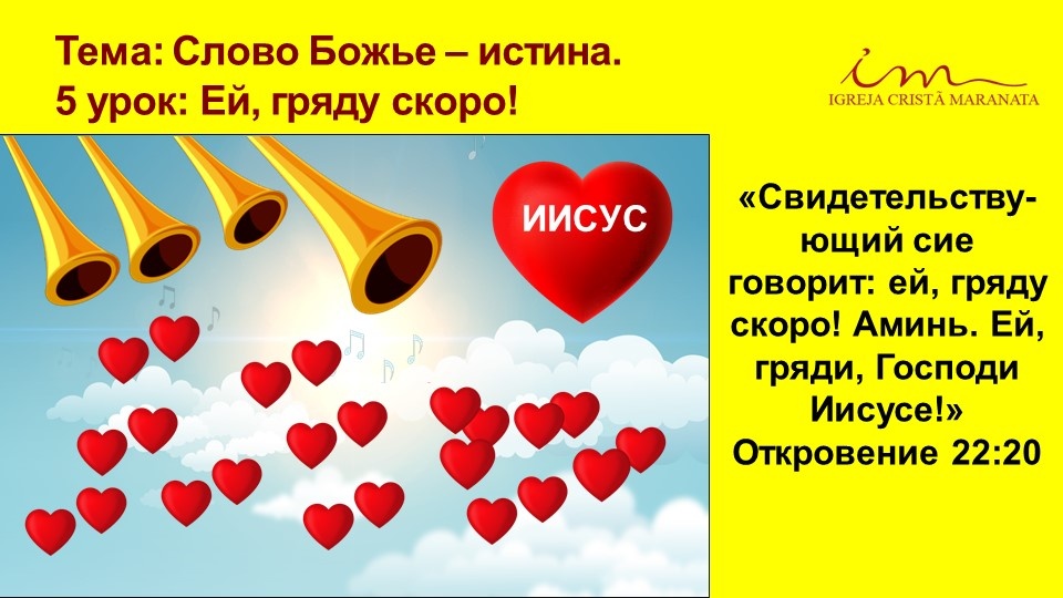 «Свидетельствующий сие говорит: ей, гряду скоро! Аминь. Ей, гряди, Господи Иисусе!» Откр 22:20. Детям Библия — Слово Божие, и все, что в ней написано, — истина. Она говорит нам, что Иисус вернется, чтобы забрать нас и привести на прекрасный праздник на небесах. Это будет самый удивительный праздник из всех: свадьба Иисуса с его Верной Церковью, которая является Его невестой. Но никто точно не знает ни дня ни часаэтого праздника. Ни папа, ни мама, ни пасторы, ни ангелы не знают. Только Бог Отец знает, когда это произойдет. Это будет большой сюрприз! Когда у вас есть важное событие в жизни, например, день рождения, что делает мама, чтобы вы не забыли об этом? Она определяет день, когда будет праздник. Итак, мы считаем дни до наступления этого замечательного дня, верно? Но что касается праздника на небесах, мы не знаем дня, когда Иисус придет за нами, поэтому нам всегда нужно быть готовыми! Чтобы подготовиться к этому празднику, Иисус рассказал нам историю (Луки 12:35-43). Он рассказал,