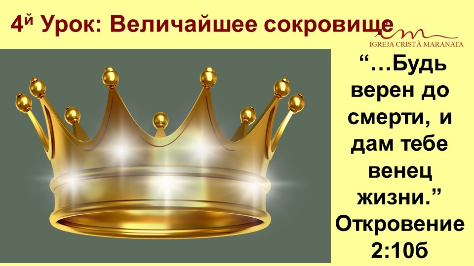 “Будь верен до смерти, и дам тебе венец жизни.” Откровение 2:10б. Введение Сегодня мы поговорим о братьях и сестрах церкви в Смирне. Иисус, зная обо всем, видел все их страдания и пожелал направить им особое послание. Поэтому, Он попросил апостола Иоанна, который был в ссылке на Патмосе, написать им письмо, полное слов любви и чудесное обетование, чтобы ободрить эту мужественную церковь. Эти братья и сестры были храбрыми и верными, они хранили веру в Господа в своих сердцах. И знаете, что самое интересное? Это послание было не только для них, но также и для нас, тех кто следует за Иисусом сегодня! Основная часть Какой же была жизнь церкви в Смирне? Они жили в очень трудный период! Им приходилось собираться, молиться и проповедовать об Иисусе тайно, чтобы никто не увидел. Они не могли открыто проповедовать Иисуса, потому что правительство не позволяло этого. И знаете, что самое интересное? У них даже не было Библии, в таком виде, каком мы имеем сегодня! Но не смотря на всё это, Слово