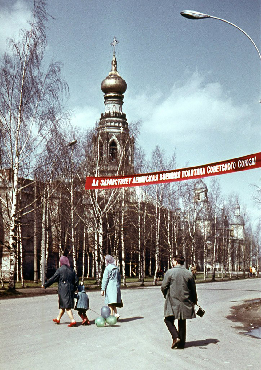 Растяжка с лозунгом "Да здравствует Ленинская внешняя политика Советского Союза!" конечно портит вид на историческое наследие Вологды, но она хотя бы провисела тогда всего пару дней на майские и всё, а вот здоровые буквы у Софийского собора про любовь к Вологде сейчас, видимо будут ещё долго шрамом на красотах Софийского собора.