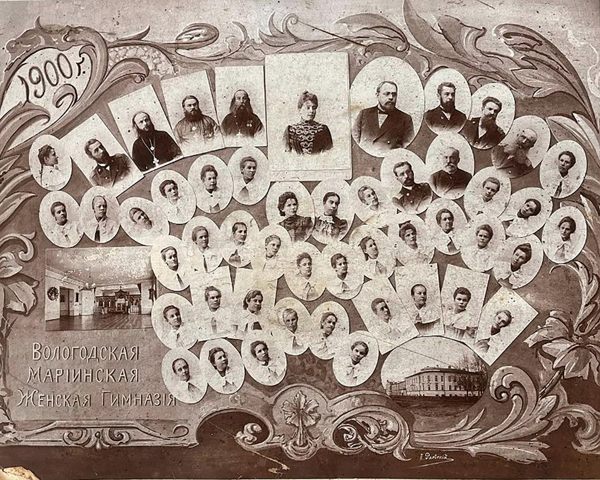 1900 год. Фото выпускниц Мариинской женской гимназии. 14 июня 1858 года состоялось открытие Вологодского перворазрядного училища для девиц. В апреле 1860 года оно переехало в собственное трехэтажное каменное здание на Малой Благовещенской улице, которое можно видеть на втором снимке. Сейчас это перекрёсток улицы Батюшкова и проспекта Победы. По указу Сената от 11 мая 1863 года Вологодское перворазрядное женское училище получило наименование Вологодской Мариинской женской гимназии.
