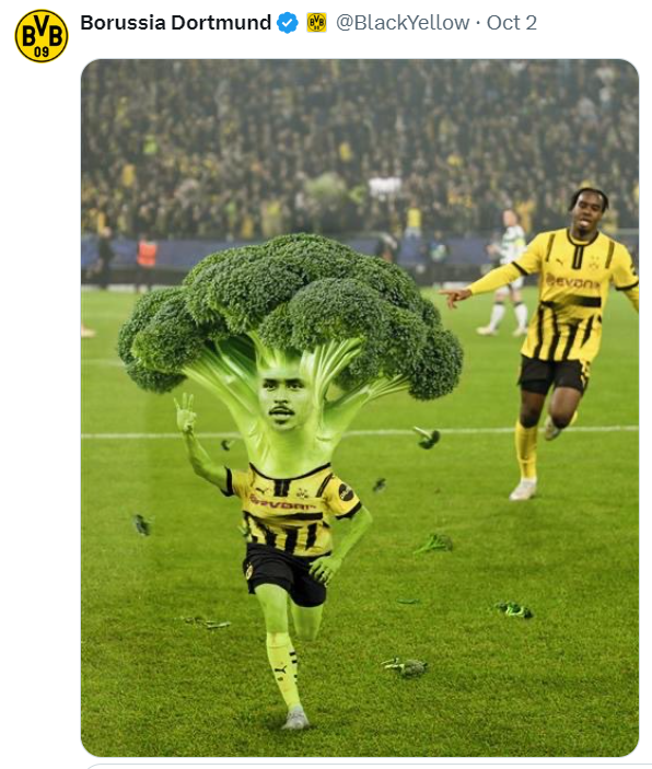 Карим Адейеми – главная звезда прошедшего тура общего этапа Лиги чемпионов. В матче с «Селтиком» вингер «Боруссии» за 31 минуту оформил хет-трик, дортмундцы разгромили соперника со счетом 7:1. Адейеми признали игроком недели в ЛЧ. После матча журналисты пытались выяснить, как немцу удалось выдать такой перфоманс. Ответ Карима рассмешил корреспондентов: «Не знаю, что делает меня таким сильным. Вчера моя девушка приготовила брокколи, может быть, поэтому. Нет, фуфу [традиционное нигерийское блюдо: Карим говорил, что оно придает скорость] перед игрой не ел, может, съем завтра». Слова Карима так сильно впечатлили админа аккаунта «Боруссии» в X, что на свет появилось это: Шутку дортмундцев подхватили болельщики: 💭 «Фуфу, брокколи...» 💭 «Жена Хавертца ему ничего не приготовила». 💭 «А вообще-то он и выглядит, как 🥦». 💭 «Карим Адейеми с брокколи VS Карим Адейеми без брокколи». 💭 «Состав «Боруссии» на следующий матч». Говорят, после победы над «Селтиком» в Дортмунд заехали грузовики с брок