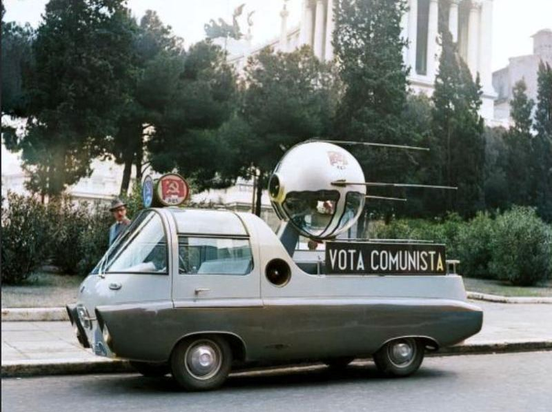 Но всё непросто: на Западе были тогда и те, кто искренне радовался этому шагу прогресса и успеху СССР и всего человечества... 1950-е. Агитационная машина Итальянской коммунистической партии с макетом спутника и призывом голосовать за коммунистов