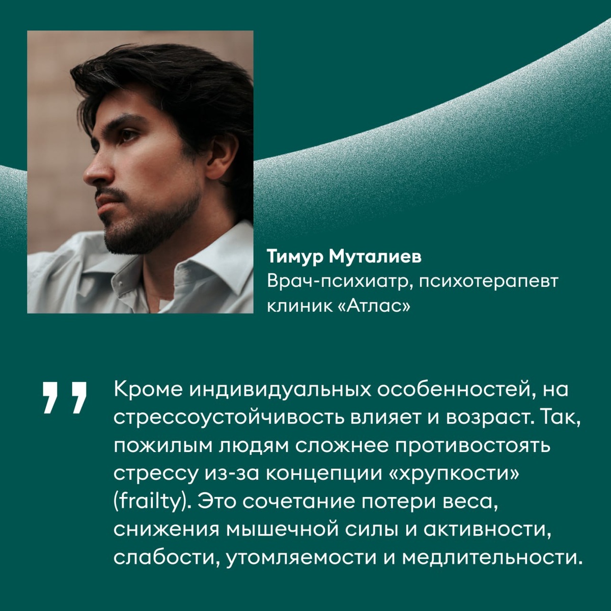 Стресс не только мешает наслаждаться жизнью, но и провоцирует различные заболевания. Поэтому стресс-менеджмент так важен для превенции болезней. Восприимчивость к стрессу и адаптационные возможности зависят от множества факторов, включая хронические заболевания, когнитивные нарушения и социально-экономические условия. • Frailty — хрупкость, сниженная способность к адаптации • Длительность рабочего дня более 10 часов • Воздействие профессиональных вредных факторов: вибрация, повышенное зрительное напряжение, плохая организация рабочего места • Оценка своего здоровья как «среднее» • Нарушение режима работы и распорядка дня из-за частой смены часовых поясов и перелетов • Наличие серьезного психоэмоционального переживания в прошлом • Наличие соматического заболевания или психологического расстройства • Отсутствие регулярной половой жизни • Воздействие вредных факторов окружающей среды