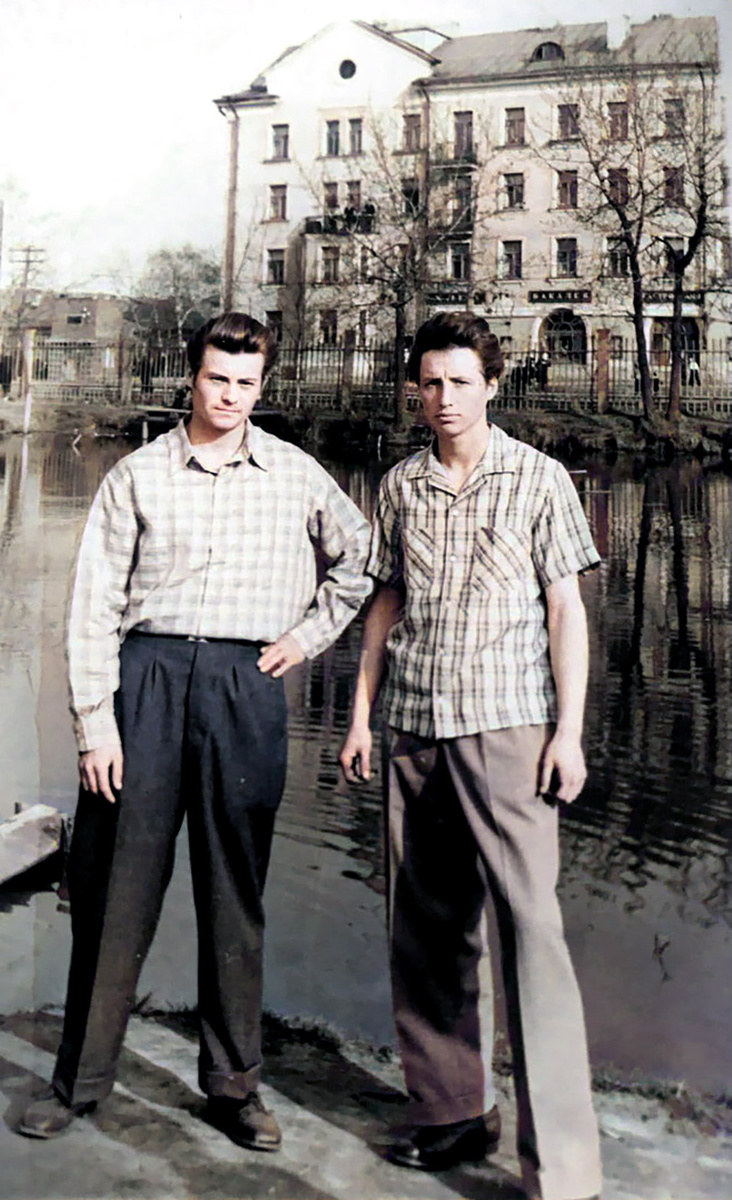 Парни позируют у пруда в бывшем Самаринском саду. Начало 1960-х На заднем плане дом у перекрёстка современных Зосимовской и Ветошкина. Его построили к 1952 году и тогда улицы назывались Калинина и Железнодорожная соответственно. На месте пруда к 1967 году возвели дворец спорта "Юбилейный".