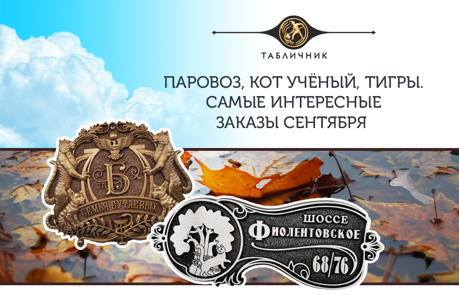 Источник фонового фото на баннере: unsplash.com Весь минувший месяц вы продолжали радовать нас необычными заказами и тёплыми отзывами. По традиции мы собрали всё самое интересное в одной статье! Любой дизайн из нашего каталога можно видоизменить, чтобы получилось уникальное и неповторимое изделие. Превратить адресную табличку на дом в предупреждающую? Написать вместо адреса фамилию хозяев? Добавить нестандартное изображение? Без проблем! Только за этот месяц мы изготовили таблички с якорем, государственным гербом, кораблём и даже паровозом. Но лидируют по популярности изображения животных. Дикий зверь поведает о вашем характере и станет символическим защитником дома. Литой портрет домашнего питомца может вызвать умиление у прохожих, отпугнуть непрошеных гостей или просто повеселить народ. Смотря что за питомец и с каким текстом! А вот это уже не просто животное, это пушкинский персонаж. Перед такой табличкой-иллюстрацией люди будут останавливаться, как в музее! Бывает и так, что готов