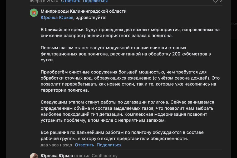 Областные власти рассказали о мощности очистных сооружений на мусорном полигоне под Советском, который планируют установить в октябре. Цифры озвучило региональное министерство природных ресурсов и экологии в комментариях на странице губернатора Алексея Беспрозванных в социальной сети «ВКонтакте». По словам ведомства, областные власти собираются приобрести очистные сооружения большей мощности, чем требуется на самом деле. Это необходимо для обработки как уже имеющихся на полигоне сточных вод, так и новых. Как отметило минприроды, стоки образуются ежедневно из-за сезона дождей. Работы по снижению распространения неприятного запаха под Советском собираются провести в два этапа. «Первым шагом станет запуск модульной станции очистки сточных фильтрационных вод полигона, рассчитанной на обработку 200 кубометров в сутки. <...> Следующим этапом станут работы по дегазации полигона. Сейчас занимаемся определением объёма и состава выделяемых газов, что позволит нам выбрать наиболее подходящий тип