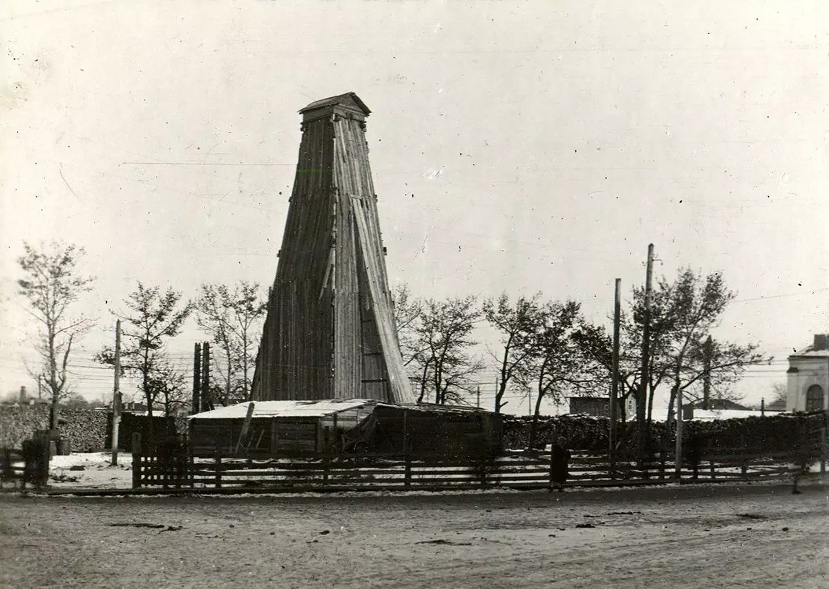 На снимке 1937 года деревянная конструкция стоит в том месте, где раньше находилась Вознесенская церковь на Извести. Что бы вы сразу поняли, где это, посмотрите в правую часть снимка. Там слегка выглядывает корпус электростанции имени Н.А. Смирнова, которую в 1959 году переоборудовали в спортивный зал. Да, это тот самый "Труд", стоявший в начале современной улицы Мира. Соответственно, слева за кадром въезд на Октябрьский мост. Вокруг этой деревянной конструкции можно видеть большие запасы дров. Для выработки электроэнергии на станции использовалась котельная и топливом для неё служили дрова. Их сюда доставляли по реке, подавали к элеватору и с его помощью выгружали уже во двор станции. Здесь они разделывались и укладывались для хранения. По мере необходимости дрова погружались в вагонетки и по рельсовым путям подавались к топкам котлов. Таким образом это работало. Но, вернёмся к этой деревянной конструкции. Это артезианская скважина. Их по городу в то время сделали несколько штук.