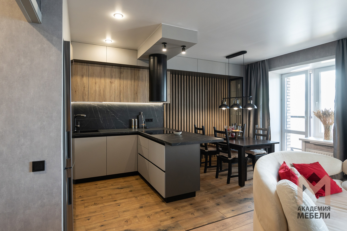 Сочетание серого цвета и декора дерева — классика. Смотрится строго, но изысканно. К нему добавили столешницу и стеновую панель в декоре "Пьетра Гриджиа черный".