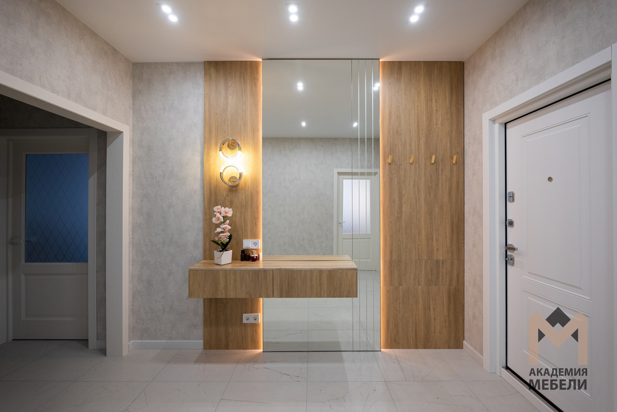 Наша новая работа — установили мебель на Карпогорской,14 в г. Архангельск. Начнем с прихожей. В создании уютного и стильного интерьера природным оттенкам нет равных. Самый популярный — древесный декор. В данном проекте это основной цвет, который дополнили большим зеркалом. Для изготовления этого комплекта использовали сочетание материалов: корпуса ЛДСП "Дуб гамильтон натуральный", фасадов и панелей МДФ "Дуб европейский". Текстура дерева смотрится очень элегантно, наполняя помещение уютом и теплом. Зеркало — главный акцент прихожей. Высота до потолка и светодиодная подсветка по периметру придает интерьеру особый стиль. При этом, оно визуально расширяет пространство, наполняя его светом. Во входной зоне мы разместили удобные крючки для верхней одежды. Рядом — длинная консоль с двумя выдвижными ящиками. В ней с легкостью поместятся ключи, перчатки, средства для читки обуви и другие предметы. Мебель в прихожую получилась акцентной, легкой и функциональной. Идеальный вариант для небольших п