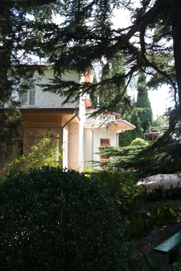 Сквер действительно очень хорош! - и улица, уходящая куда-то вниз... и дом с деревянной хрупкой верандой... и ещё улочка Музейная, куда я сперва повернула, но на экскурсии сказали, что как раз там и была калитка, там были ворота. А сейчас мы заходим через "соседей", где ныне современное административное здание музея (там показывают фильм, проходят выставки, вечера, там продают билеты, и т.д.). А садик и домик Чехова как раз примыкают к узенькой и трогательной Музейной улице в бывшей деревне Аутка (не Алупка!). Сейчас, разумеется, это всё срослось намертво с Ялтой. Та вообще похожа на Лос-Анджелес, ей-богу! - всё какие-то посёлки (Пасадена, Монтесито, Санта-Моника), которые образуют Большую Ялту, куда входят и Гурзуф, и Кореиз, и Симеиз, и Гаспра, и Мисхор...