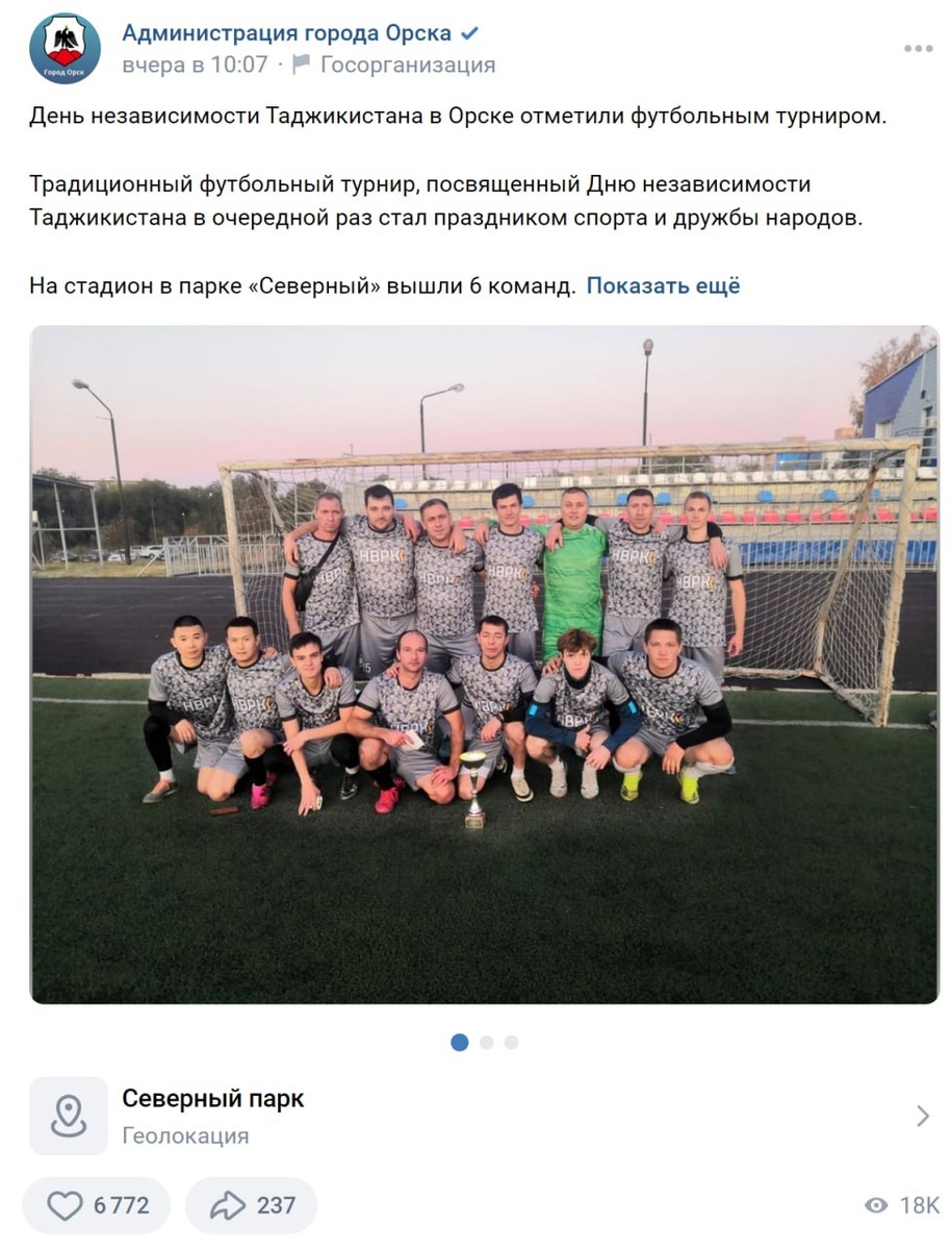 В городе Орск (Оренбургская область) прошел футбольный мини-турнир, приуроченный ко дню независимости Таджикистана. Почему в российском городе отмечают день независимости другого государства – вопрос, которым сейчас задаются многие крупные телеграм-каналы (1, 2, 3, 4). Сообщается, что лучшим на мини-турнире, организованном при поддержке местных чиновников, стала команда орского вагонного завода, второе место заняла команда «Нурислам», бронзу завоевал «Памир». Вся информация опубликована на официальной страничке администрации города в VK. Но вот ведь странное дело – комментарии оказались закрыты. Однако в других постах группы комментарии открыты – можете задавать вопросы, если они у вас появились. Не знаю, замешен ли в проведении этого мини-турнира Оренбургский областной футбольный союз, но на всякий случай уточнить эту информацию можно напрямую у президента союза Александра Кудряшова (почта: fsor92@mail.ru, телега). И совершенно точно на все вопросы вам ответят на сайте администр