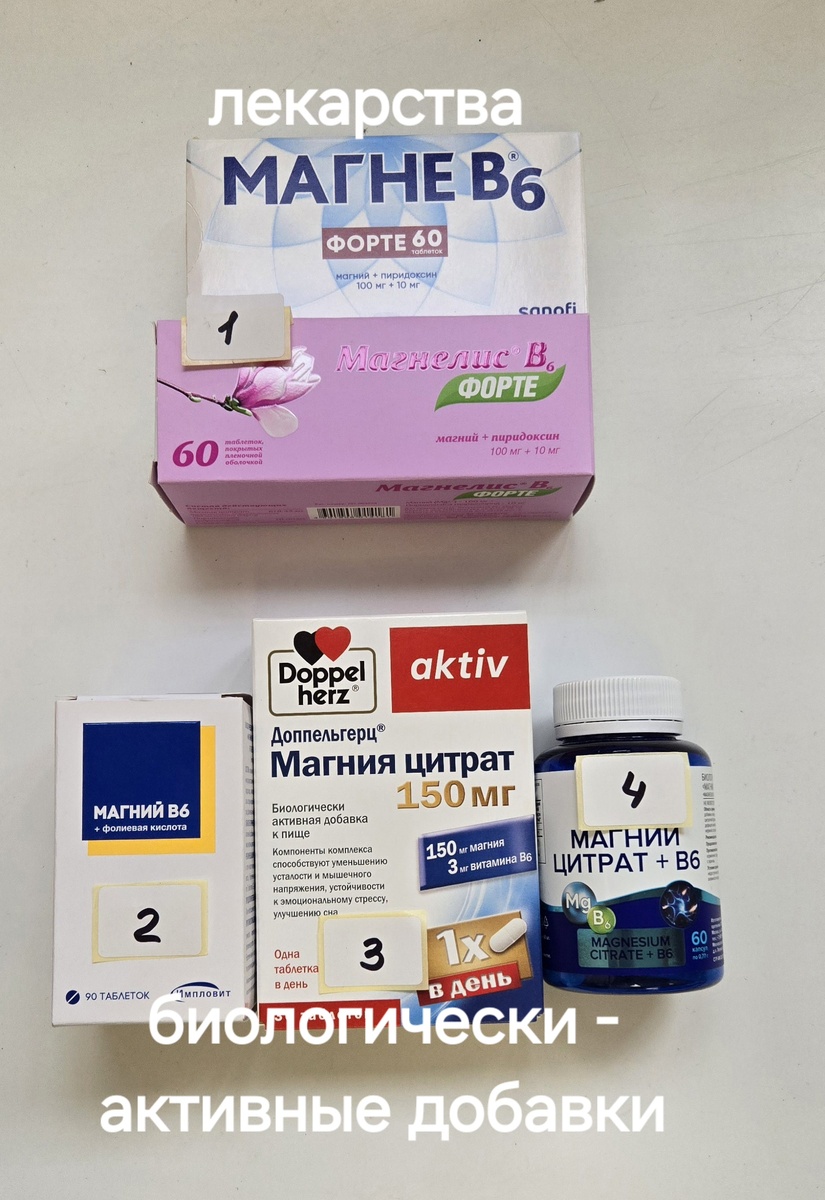 Предпоследние исследования и разработки вывели ЦИТРАТ Магния на рынок. Быстрое действие. Практически на второй день чувствуете облегчение, если беспокоят судороги в ногах от нехватки этого элемента. Если плохое настроение и раздражительность, то примерно через неделю ощущаете себя человеком, а не кипящим по пустякам чайником ) Препаратов много и все рабочие. Проверено!!!! Разные производители, дозировки и вспомогательные вещества. Более простые могут давать меньший, замедленный эффект и бОльший риск аллергии. Традиционно ЛЕКАРСТВА: 1. Магне В6 форте (Венгрия) и. Магнелис В6 форте (Россия) - 100мг чистого магния, прием 3-4 табл в сутки, упаковка на 20дней. БАДы Какие то содержат витамин В6 в составе (для лучшего усвоения Магния), какие -то нет. Разницы, если честно, не заметила. Цитратная форма сама по себе без добавления В6 хорошо усваивается и работает. 2. Магний Импловит (Россия) - 400мг в 6таблетках, упаковка на 15 дней с вит В6 3. Доппельгерц Магний (Германия) пред
