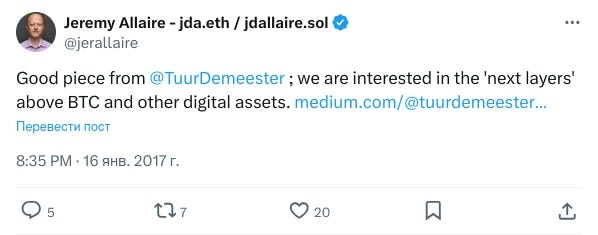 Сейчас понятие “L2” кажется прочно захваченным Ethereum с попыткой проникновения роллапов — практически единственной технологии, которая там работает — в Биткоин. L2 означает Layer 2, и понятие оказалось удачным для сообщества ETH. Маркетинговые кампании 2021-2022 годов пытались ассоциировать с Layer 2 такие сети как Polygon, контролируемые в тот момент мультиподписями. Однако “Слои” были не только удачной маркетинговой находкой для Ethereum в кризисе масштабирования, а служили отличным нарративом в “Blocksize War” — так называемой “войне” за размер блока между группировками внутри Биткоина. Например Tuur Demeester с весны 2017 очень активно пропагандировал идею масштабирования Биткоина через слои (и до сих пор разделяет эту позицию), и удостоился отметки основателя Circle (выпускает USDC). Аргумент был построен таким образом: Биткоину не нужны большие блоки, поскольку платежи и другие функции (включая смарт-контракты), будут осуществляться вне цепочки, вне “базового слоя”.