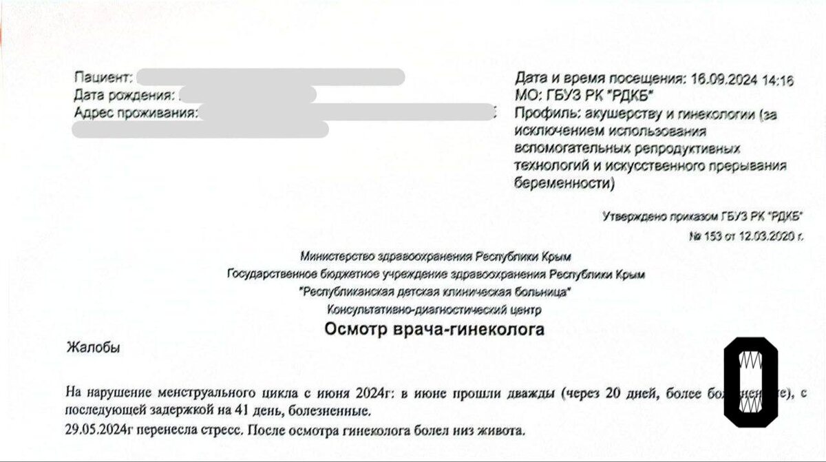 Военный из Крыма обратился в Следственный комитет из-за гинекологического осмотра своей 15-летней дочери, на котором присутствовали студентки-практикантки. Отец Даши (имя изменено) утверждает, что его дочь испытала сильный стресс и стыд из-за присутствия посторонних во время осмотра, который был назначен после её обморока на экзамене ОГЭ, пишут «Осторожно, новости».