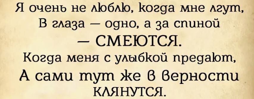 Я не люблю, когда всё время хвалят. Я не люблю, когда мне льстят и врут. Когда кого-то всей толпою травят, Когда не ценят посторонний труд. Я не люблю, когда слова пустые, Когда мне в душу лезут в сапогах. Я не люблю терзания ночные И у любимых слёзы на глазах. Я не люблю непрошенных советов, И обещаний или клятв пустых. Я не люблю беспочвенных наветов, Фальшивых и назойливых "святых". Я не люблю, когда берут "нахрапом". Я грубости и наглость не терплю. Я скрытных не люблю, кто "тихим сапом". Зато я искренность и преданность люблю.