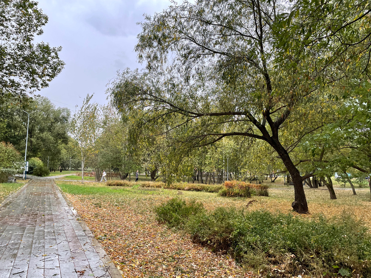 Осень в городе совсем другая. На даче её пока ещё нет, там цветы, трава зелёная. Тут вышли - под деревьями сухие жёлтые листья, вместо травы - рыжий подстриженный до нуля рулонный газон. Потом в других местах и трава нашлась - ярко-зелёная, как на даче. До тех мест газон не дотянули. Деньги, наверное, кончились.