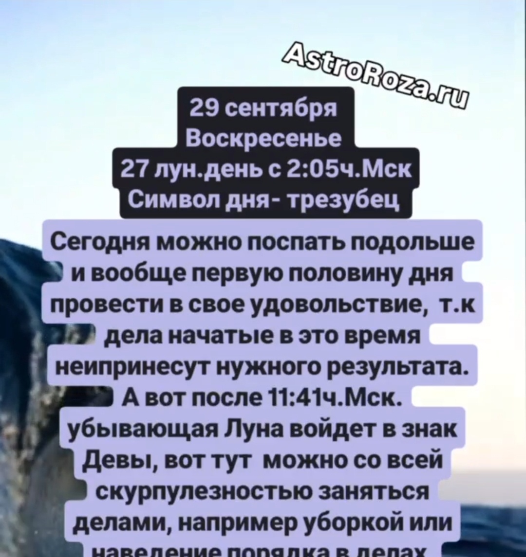 Сегодня можно поспать подольше и вообще первую половину дня провести в свое удовольствие, т.к дела начатые в это время неипринесут нужного результата. А вот после 11:41ч.Мск. убывающая Луна войдет в знак Девы, вот тут можно со всей скурпулезностью заняться делами, например уборкой или наведение порядка в делах, бумагах и пр. В 27 лун.день хорошо заниматься медитацией и обретение духовных знаний. ⛔️алкоголь ⛔️ иллюзии Сны и приметы вещие ✅️стрижка ✅️покупки #гороскоп #астрология #луна #астрологияонлайн #астропрогноз #овен #телец #близнецы #рак #лев #дева #весы #скорпион #стрелец #козерог #водолей #рыбы #затмениесолнца #солнечноезатмение #затмение #новолуниевблизнецах #загадываемжелания #загадайжелание #желание #Венера #мечтысбываются #полнолуние