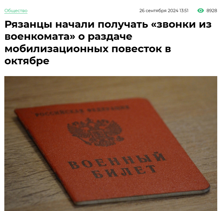 Рязанцам звонят из военкоматов и сообщают о раздаче повесток на мобилизацию в зону СВО в октябре, утверждают в соцсетях и некоторых региональных медиа. Однако слухи не подтвердились. Информацию о звонках из военкоматов опровергла опергруппа правительства Рязанской области, назвав ее фейком. «Рязанцы не могли получать «звонки из военкомата» о раздаче мобилизационных повесток в октябре. По одной причине — никаких звонков военкоматы не делают. Любое СМИ может проверить информацию в военкомате, это дело одной минуты. О мобилизации в октябре вообще речи не идет», — констатировали чиновники областного правительства. Местные власти также призвали жителей пользоваться только проверенными источниками информации. Отметим, что рязанское издание, которое опубликовало фейк, уже выпустило опровержение. Добавим, что вопрос второй волны мобилизации становится частым поводом для вбросов. Российские власти неоднократно подчеркивали, что необходимости в дополнительной мобилизации нет, она закончилась о