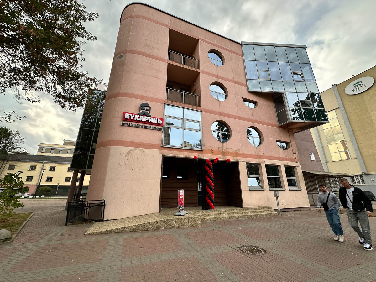 Обосновались там, где «Мята» устала - большой второй этаж в здании на Хмельницкого. Сразу понял, чьих рук дело, когда откуда ни возьмись, как из табакерки выскочил шеф-повар гастробара «Зелень», их же и пивнуха «Пиплс». Фишка трио - недорогие углеводы на грани закуски под пиво, которое они сами и варят, Талер называется. Новый «Бухаринъ» не исключение: борщ - 9р, гренки - 5р, тартар, надеюсь, не кусался - 14р, пицца от 7 до 17р. Проверим качество.