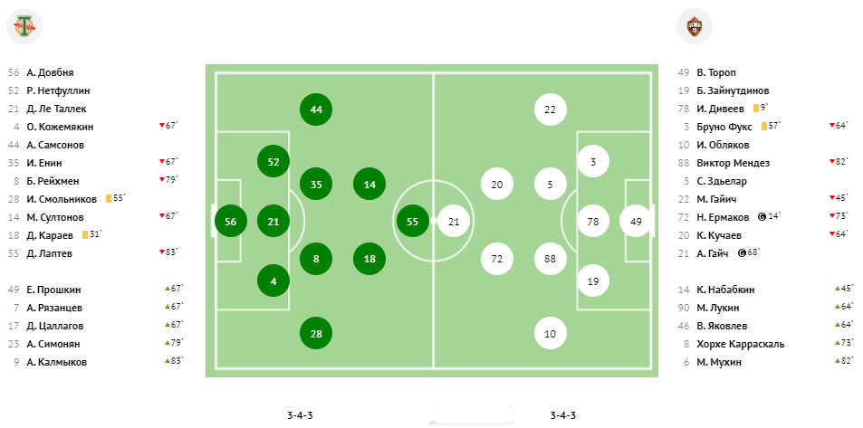 ЦСКА (футболки - белые): Тороп, Фукс (Лукин, 64), Дивеев, Зайнутдинов, Гайич (Набабкин, 46), Зделар, Мендес (Мухин, 82), Обляков, Кучаев (Яковлев, 64), Гайч, Ермаков (Карраскаль, 74).