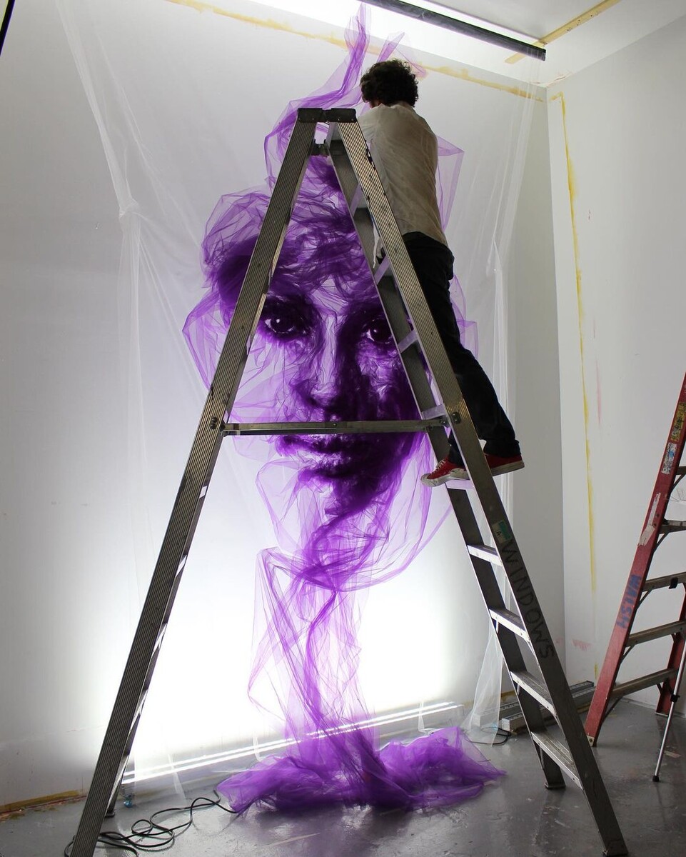 Британский художник Бенджамин Шайн стал заметной фигурой в мире современного искусства благодаря своей уникальной технике работы с тюлем и переработанными материалами. Его произведения выделяются благодаря оригинальному подходу, который сочетает в себе элементы объёмного и плоскостного искусства. Тюль и шифон в руках художника передают глубину и эфемерность человеческих эмоций, делая его работы легко узнаваемыми и философски насыщенными. Одной из главных черт творчества Шайна является его способность превращать хаотичную структуру тюля в детализированные трёхмерные портреты. Эта техника зародилась ещё во время его учёбы в Сент-Мартинс, когда он обратил внимание на то, как причудливо ложатся складки шифона. Этот момент вдохновил его на разработку метода, который позволяет сочетать объём и тонкость. Его работы из тюля кажутся воздушными, словно акварельные картины, но при этом они удивляют своей натуралистичностью. На создание одного произведения уходит более 50 часов, а сложные проекты