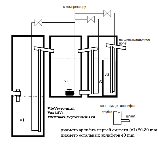 диаметр трубки айрлифта первой ёмкости (v1 на схеме) 20 mm, остальных аэролифтов 40 mm. объем аэротанка должен быть равен 1-2 суточному сбросу. фактически вам нужно суточный объем сточных вод перелить в аэротанк часов за 20. объем отстойника (v3 на схеме) должен быть больше 2 объёмов максимального залпового сброса + емкость в которой будет размешаться насос или айрлифт.