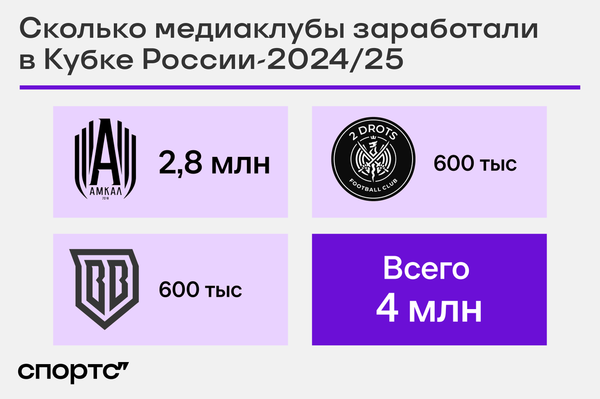 Больше всего – «Амкал». «Амкал» проиграл «Алании» (0:1) и вылетел из Фонбет Кубка России. Последним из медийных – ранее турнир покинули «Броуки» и 2Drots. Три клуба заработали в Кубке 4 миллиона рублей – рекордные призовые для медиакоманд. Из чего складывается сумма? Размер призовых прописан в регламенте Кубка России. Участникам Пути регионов полагается бонус за победу на каждой стадии. В первом раунде – 600 тысяч рублей. Во втором – 700 тысяч. В третьем – 1,5 млн. В четвертом – 2 млн. В пятом – 3 млн. В шестом – 3,5 млн. Сколько заработали медиаклубы? ● 2Drots обыграли «Строгино» (1:0) в первом раунде, но срезались на «Спартаке» из Костромы (0:1) – 600 тысяч рублей. ● «БроукБойз» прошли «Квант» (1:1; 4:2 П), но проиграли дзержинскому «Химику» (0:1). Одна победа в первом раунде – 600 тысяч. ● Больше всего заработал «Амкал», дошедший до четвертого раунда. Победы над «Коломной» (8:1), «Велесом» (2:0) и «Космосом» (2:0) принесли 2,8 миллиона рублей. А сколько было в прошлые сезоны? 4 милл