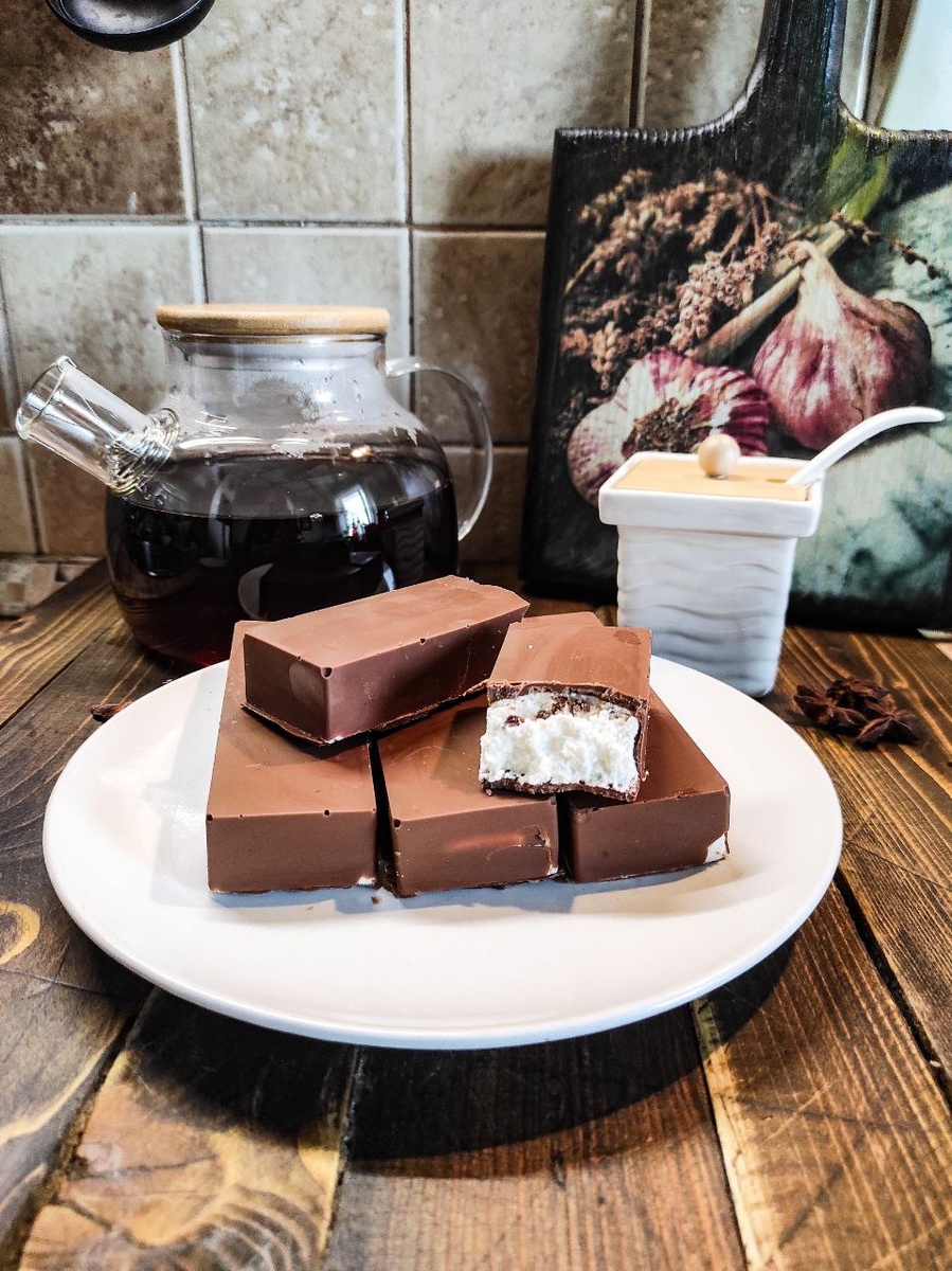 НА 8шт 3-3,5 плитки шоколада Аленка (по90гр) 3 пачки творога по 180гр Сахар 2-3чл Силиконовая форма ✅ Шоколад растопить на водяной бане ✅Смазать тонким слоем дно и стенки формы и убрать в морозилку на 10минут ✅ Достаем аккуратно раскладываем творог в форму, сверху смазываем шоколадом и убираем снова в морозилку на 10 минут Готово ❤️