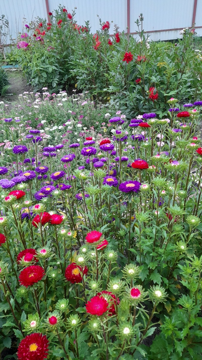 Вчера удалила с цветников последние однолетние цветы. Не потому, что все отцвели, они-то ещё покрасовались бы, но пора заняться серьёзными пересадками, а они мешают. Оставила немного поздних астрочек на семена, а остальных всех однолетних собратьев кого куда. Бархатцы все ушли в борозды при посадке картофеля, какие-то свалила в яму для поднятия участка, а остальные просто улетели в компост. Большого разнообразия однолеток у меня в этом году не было, но по количеству оказалось много. На моей плодородной почве они растут очень крупными, гораздо больше заявленных размеров. Хорошо это или плохо? Это для кого как. И смотря для какой цели они сажались. С одной стороны, высокие, крепкие кустики смотрятся лучше, заметнее, но это если посажены они именно с такой целью – показать себя. Я с такой целью только астры, левкои и вербену сажала. Было немного свободного места до осени, до посадки роз, надо было это место чем-то занять, а в таких случаях однолетки прям спасение! Вот, например, астры мен