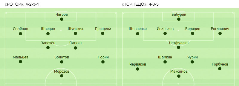 «Ротор» (футболки – синие): Чагров, Семёнов, Швецов, Шумских - к, Прищепа, Пяткин (Соколов, 63), Завезён (Плотников, 46; Шильников, 77), Болотов (Усанов, 74), Мальцев, Тюрин, Морозов (Агеев, 63).