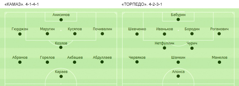 «КАМАЗ» (футболки – белые): Анисимов – к, Почивалин, Маругин, Кусяпов, Гюрджан, Абрамов (Стародуб, 70), Козлов, Горелов (Фартуна, 84), Акбашев (Кириллов, 90+1), Абдуллаев (Апеков, 70), Караев (Защепкин, 70).