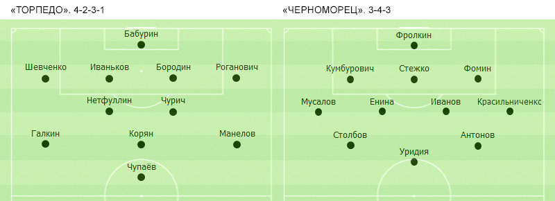 «Торпедо» (футболки – белые): Бабурин – к, Бородин, Иваньков (Данилкин, 46), Шевченко, Роганович, Нетфуллин, Чурич, Галкин (Горбунов, 57), Манелов (Камара, 57), Корян (Шитов, 86), Чупаёв (Максимов, 86).