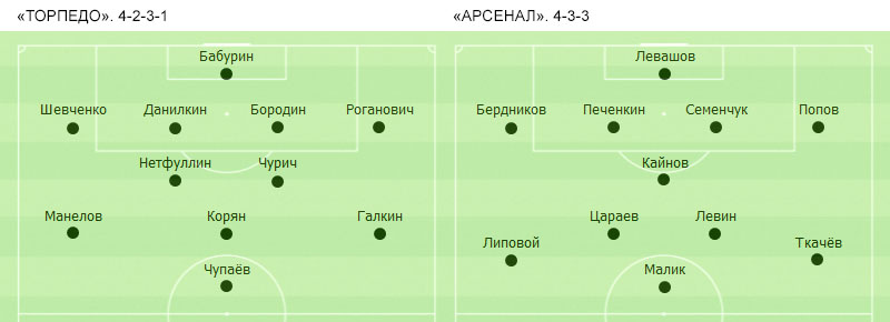 «Торпедо» (футболки – белые): Бабурин - к, Бородин, Данилкин, Роганович, Шевченко, Нетфуллин, Чурич, Галкин (Горбунов, 64), Манелов (Червяков, 81), Корян (Соколов, 64), Чупаёв (Максимов, 81).