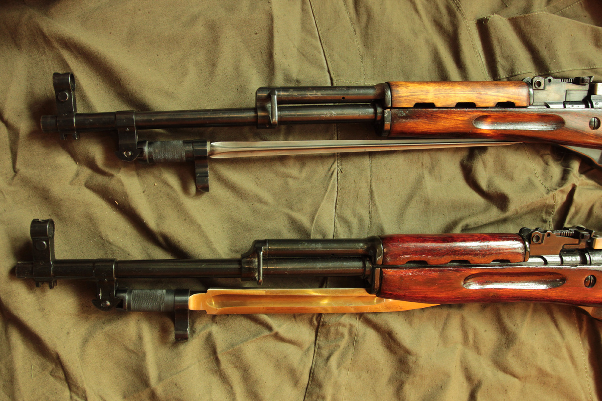 Про СКСы у нас было четыре материала. Говорили про его появление, патроны, отличие раннего от позднего. А вот тема штыков, используемых на карабине СКС почему-то осталась за кадром. Воспользовались служебным положением предоставленной возможностью это упущение исправить. Итак, сегодня у нас два СКСа: 1949 года и 1953 года выпуска. Про различия ствольной коробки и затвора уже писали и возвращаться не будем. Поговорим именно о штыках и том, что с ними связано. На СКСе 1949 года штык игольчатый, очень близкий по внешнему виду, по способу складывания и фиксации к штыку карабина Мосина обр. 1944 года. На СКС обр. 1953 года штык плоский, по форме отдаленно напоминающий штык-тесак винтовки СВТ. Или, если угодно, штык-тесак 6Х2. Способ крепления штыка к ствольной муфте и способ фиксации в боевом и походном положении у обоих штыков одинаковый. Правда, есть отличия. На 1949 выборок, работающих в качестве ребер жесткости, не было. А на 1953 появились Оба штыка изготовлены из прутка,