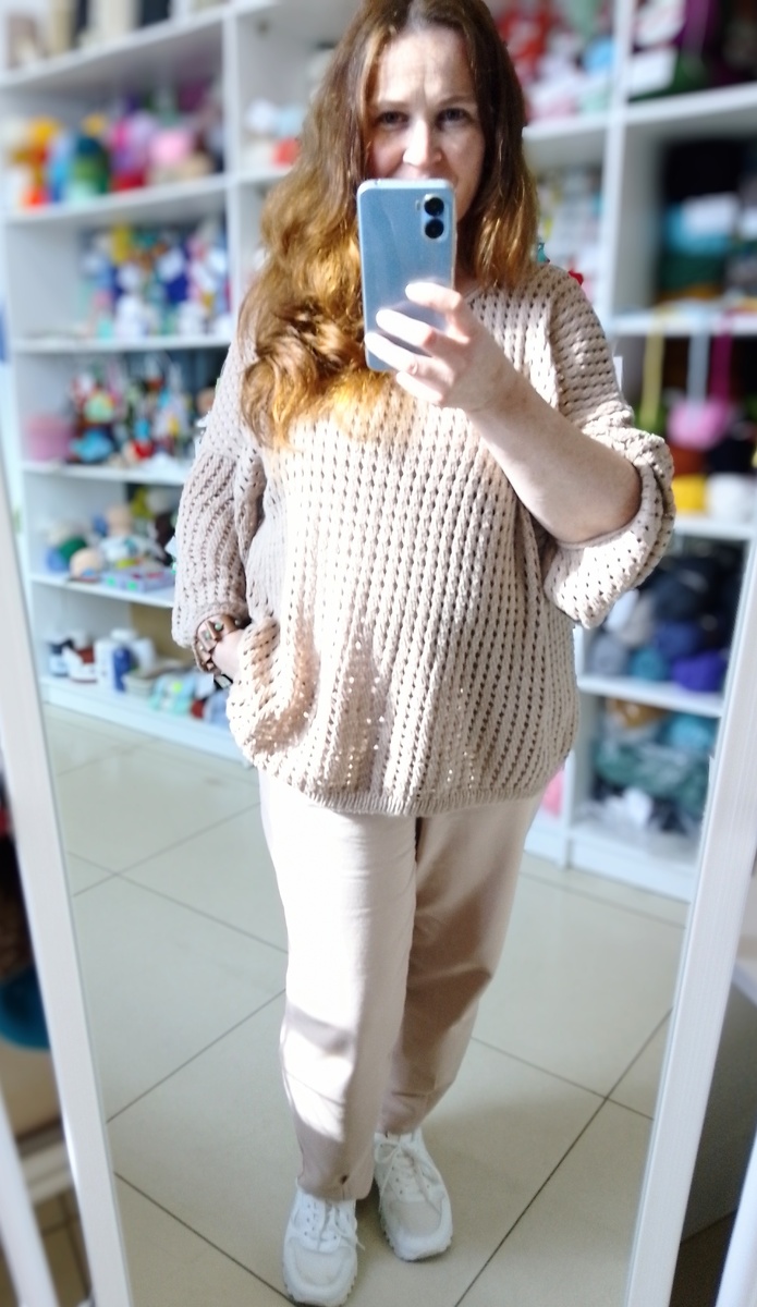 Бывает у вас такое? Вот вчера хотели надеть зелёное и весь день привлекал этот цвет. Сегодня тянет на жёлтый, а завтра вдруг синий или другой цвет? Я думаю, у многих такое наблюдается. Редко, когда весь гардероб одного цвета и нет вариантов для раздумий. Я всегда прислушиваюсь к себе. Пытаюсь понять, в какой одежде мне будет сегодня комфортно. Для меня это очень важно. Моё состояние внутреннее и настроение часто зависит, как я оделась. Удобная ли одежда. Соответствует ли она моим потребностям на сегодня. И в каждый день это разные ощущения. Сегодня захотелось тотального бежа. И я подумала. Может быть не одежда диктует мне настроение? А, наоборот, моё внутреннее состояние побуждает надеть то или иное, выбрать цвета и форму? И если отталкиваться от второго варианта, я бы сказала, что мой бежевый рассказывает о спокойствии, уравновешенности и тихой радости 😊 Именно так сегодня я себя чувствую. И удивительно, но игрушку решила тоже связать в этом цвете. Попыталась немного разбавить друг