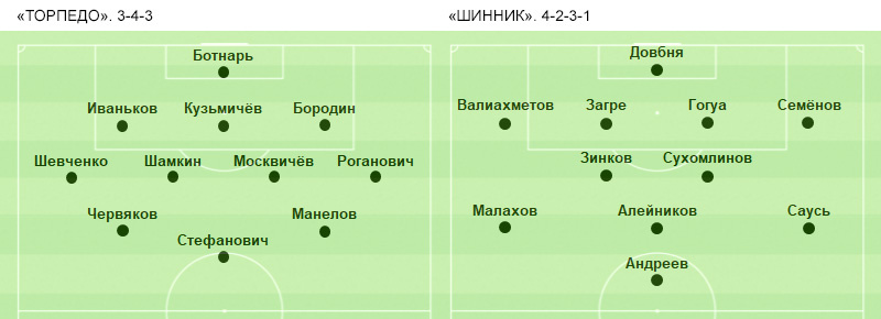 «Торпедо» (футболки – белые): Ботнарь, Роганович, Бородин - к, Кузьмичёв, Иваньков (Чурич, 65), Шевченко, Манелов, Москвичёв (Костин, 62), Шамкин (Гонгадзе, 75), Червяков (Горбунов, 62), Стефанович (Лебеденко, 62).