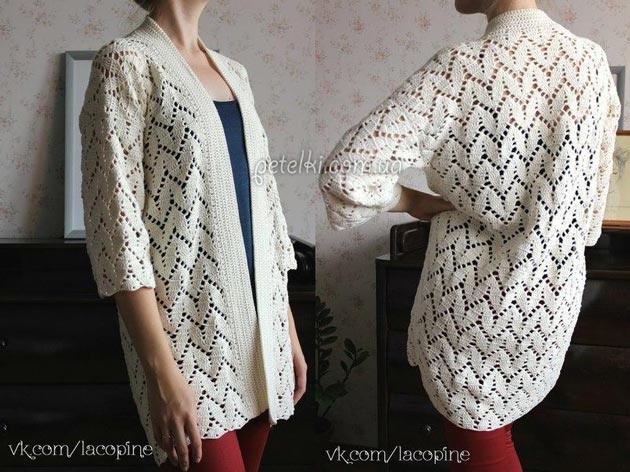 Дорогие мои девчонки, как у вас с погодой? У нас ещё тепло, но ключевое слово - ещё. Уже близится похолодание. И надо подумать над теплыми вещами. Я имею в виду вязание)) Но сегодня подборка все-же из в основном ажурных кардиганов. Может где и жакетик попадется). Я вот ещё не закончила свой ажурный кардиган и, видимо буду продолжать, а то закинется в долговязание. А руки чешутся к чему-то толстому и осеннему. И тем не менее подборка из красивых, но ажурных и с длинным рукавом. 1. 2. 3. 4. Это может и не кардиган)) Теперь много названий разных кофт, тренчей, и т. д. Но нежненький такой, мне понравился. Моя особая любовь к капюшонам. 5. Наш любимый бабушкин квадрат. Так красиво обыгран. Цвета спокойные. 6. 7. 8. 9. А вот это вообще произведение искусств. Модель Светланы Корнеевой. Стоит позаморачитваться) 10. Такой узор давно гуляет по интернету, но в виде футболок, здесь пальтишко. И тоже неплохо. Главное подобрать цвета пряжи. 11. . Наша любимая филейка. Называется модель "Хрустальн