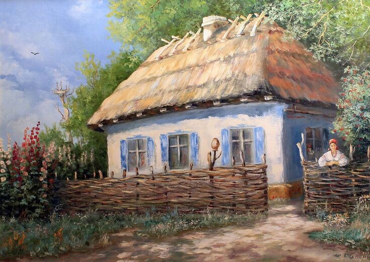 Чуть не до самых слеповатых оконцев вросла в землю хатёнка, крытая чаканом крыша пятнит полукружьем буро-зелёного мха, едва выглядывая из-за полуупавшего плетня, намертво спутанным диким хмелем , а над самой крышей сплошной зелёной завесой, ветви цветущих розовым цветом акаций.