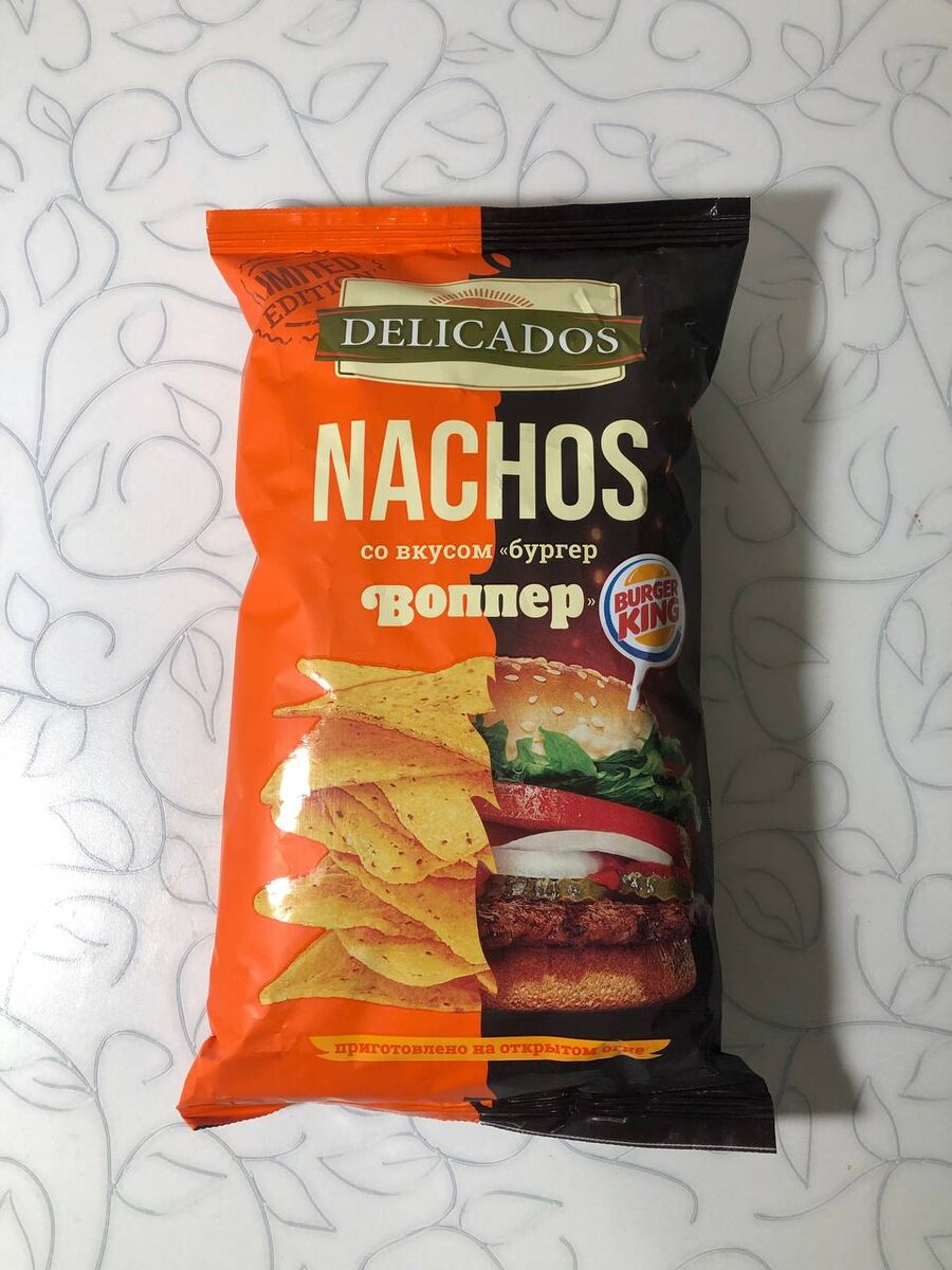 Сегодня я захотел чего-то вредного и отправился в магазин «Пятёрочка», где за 129 рублей нашёл новинку — начос со вкусом бургера «Воппер» от Delicados. Признаюсь, я не ожидал, что они окажутся такими вкусными. Вкус действительно напоминал вкус настоящего бургера, и я почувствовал, что ем его. Из минусов могу отметить, что начос оказались немного жестковаты, но это ожидаемо для такого блюда. Чтобы сделать вкус ещё лучше, я приобрёл отдельный сырный соус, и с ним начос стали просто невероятными. Рекомендую попробовать их вместе с соусом и оценить на 5 из 5. Состав: зерно кукурузы, вода питьевая, масло подсолнечное высокоолеиновое рафинированное дезодорированное, ароматизатор пищевой «бургер воппер» (мальтодекстрин, соль, сахар, усилители вкуса и аромата (глутамат натрия, гуанилат натрия, инозинат натрия), лук порошок, натуральные вкусоароматические вещества, вкусоароматические вещества, томаты порошок, чеснок порошок, регуляторы кислотности (ацетаты натрия, лимонная кислота), специи, кра