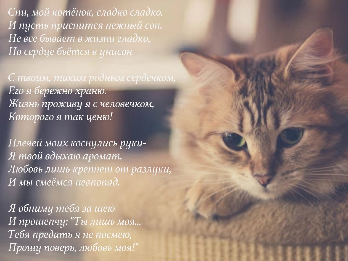 Спи мой котёнок сладко сладко. И пусть приснится нежный сон. Не все бывает в жизни гладко, Но сердце бьётся в унисон. С твоим, таким родным сердечком, Его я бережно храню. Жизнь проживу я с человечком, Которого я так ценю! Плечей моих коснулись руки, Я твой вдыхаю аромат. Любовь лишь крепнет от разлуки, И мы смеёмся невпопад. Я обниму тебя за шею, И прошепчу "Ты лишь моя" Тебя предать я не посмею. Прошу поверь, любовь моя!
