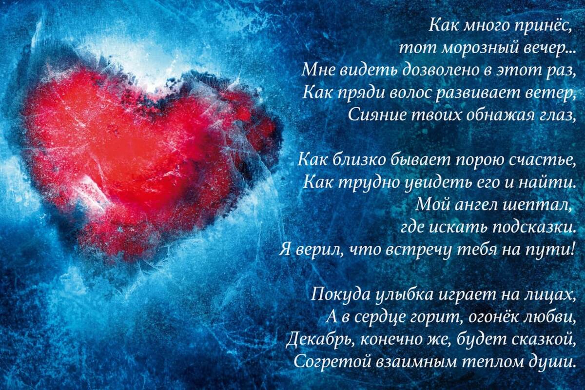 Как много принёс, тот морозный вечер... Мне видеть дозволено в этот раз, Как пряди волос развивает ветер, Сияние твоих обнажая глаз, Как близко бывает порою счастье, Как трудно увидеть его и найти. Мой ангел шептал, где искать подсказки. Я верил, что встречу тебя на пути! Покуда улыбка играет на лицах, А в сердце горит, огонёк любви, Декабрь, конечно же, будет сказкой, Согретой взаимным теплом души.