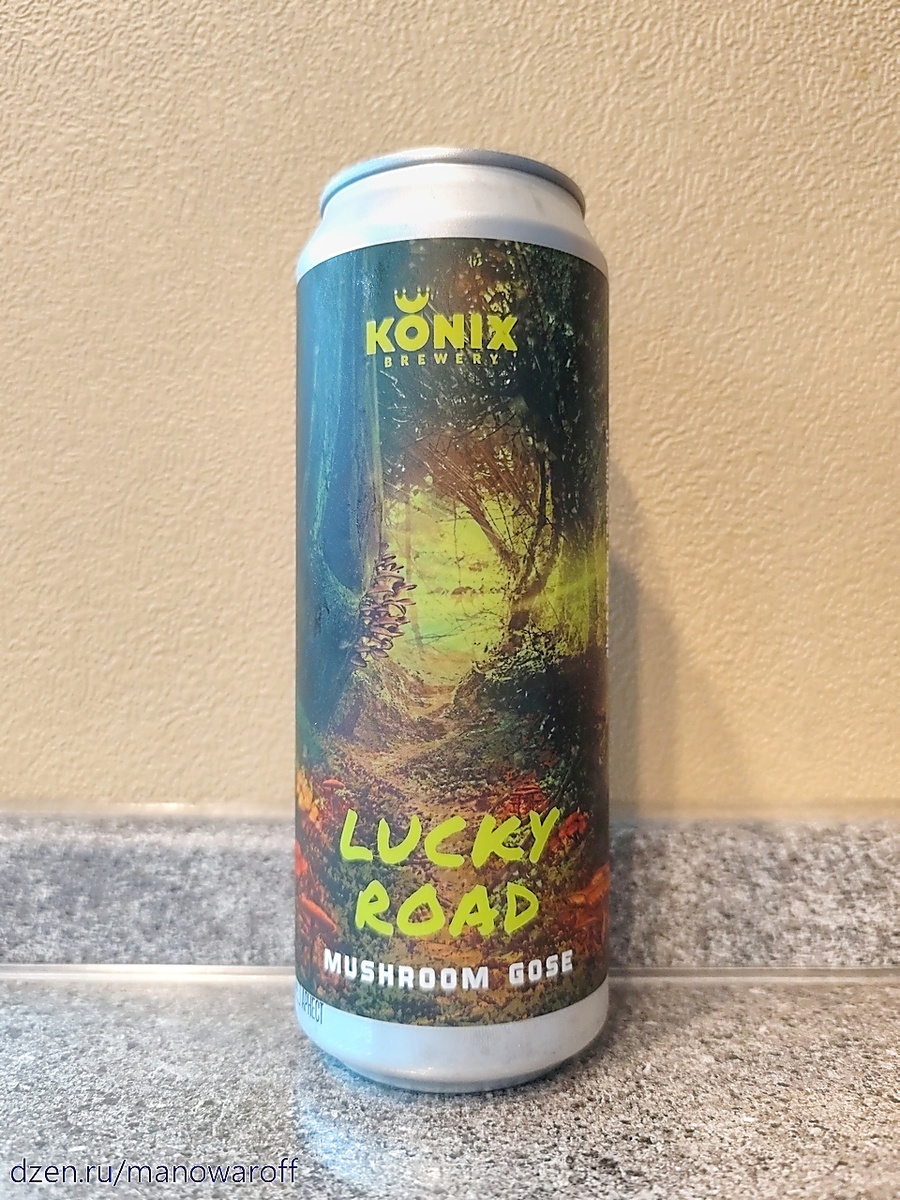 И насобираем корзинку грибов. Мечты, мечты... Ладно, обойдемся грибной гозешкой Lucky Road, которую сварила пивоварня Konix Brewery. Ну вот, уже и крупные игроки начали эксперименты с грибами. Дебют этого пива состоялся сравнительно недавно, в августе сего года. У меня банка из первой партии, а дегустация прошла через полтора месяца после розлива. Срок годности составляет восемь месяцев при комнатной температуре. Посмотрим, что нам расскажут пивовары о своем продукте: Помните то чувство, когда идешь в лес за грибами, ходишь час, два и ничего нет. И в один прекрасный момент натыкаешься на грибную дорожку. Что даже не успеваешь заметить как у тебя полное лукошко грибов. Воодушевившись данными воспоминаниям, мы решили сварить гозе с грибами и щепоткой 4х видов перцев. Кисло-соленый пшеничный эль с ярким ароматом и вкусом лисичек и легкой перчинкой. В составе, кроме каноничных ингредиентов, присутствуют: пищевой концентрат грибного бульона (соль, сушеные овощи и зелень (морковь, корень па