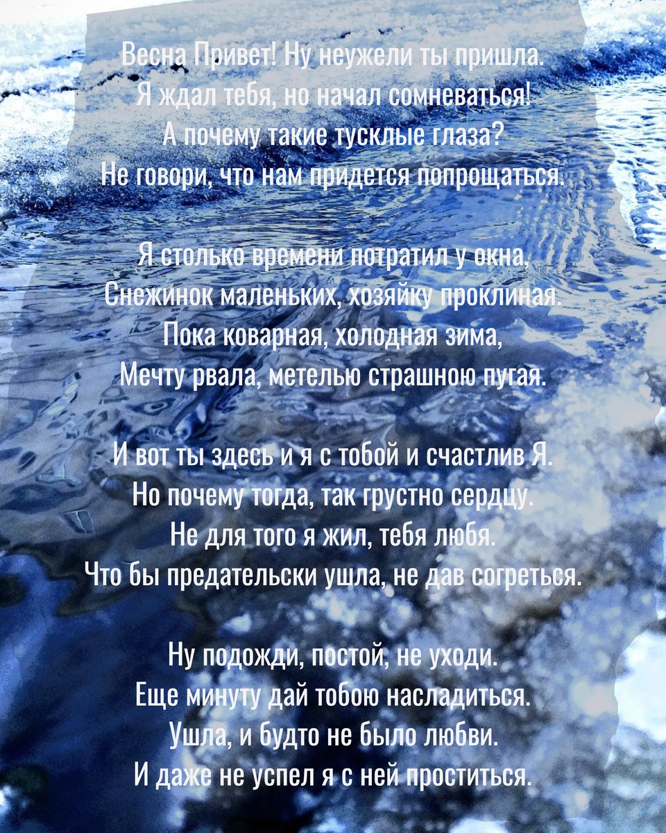 Весна Привет! Ну неужели ты пришла. Я ждал тебя, но начал сомневаться! А почему такие тусклые глаза? Не говори, что нам придется попрощаться. Я столько времени потратил у окна, Снежинок маленьких, хозяйку проклиная. Пока коварная, холодная зима, Мечту рвала, метелью страшною пугая. И вот ты здесь и я с тобой и счастлив Я. Но почему тогда, так грустно сердцу. Не для того я жил, тебя любя. Что бы предательски ушла, не дав согреться. Ну подожди, постой, не уходи. Еще минуту дай тобою насладиться. Ушла, и будто не было любви. И даже не успел я с ней проститься.
