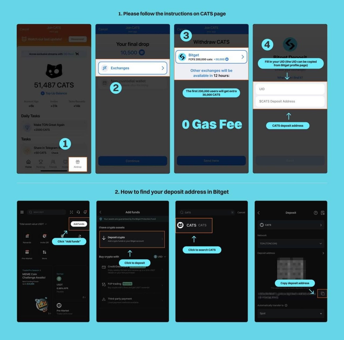 Думаю многие воркали CATS, но если кто-то не в курсе, то это проект сильно похожий на DOGS. Airdrop уже в ближайшее время, но уже можно поставить вывод на Bitget, за это нам дополнительно насыпят 30.000 токенов CATS (по премаркету это кстати почти 20$) ⚙️Для участия: 🟠Регистрируемся на Bitget 🟠В боте в разделе Airdrop подключаем вывод на Bitget (все действия на картинке к посту) 🟠Если вдруг хотите ещё залететь в проект то вот ссылка (время тут тратить не надо, получаем поинты за стаж своего тг аккаунта + задания) Жду комментариев . На какую биржу будете выводить дропчик? Полный список тапалок: NotPixel | MuskEmpire | Memefi | TapSwap | Oxygen | HOTwallet ✔️Crypto Slon в Telegram