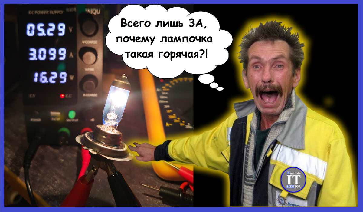 По показаниям я предполагаю, что источник питания показывает характеристики подключенного прибора. То есть в моменте на фото на лампе получилось падение напряжения 5.29 [В], сила тока в 3 [A] и примерная тепловая мощность в 16.3 [Вт]. Этого, кстати, хватило, чтобы раскалить лампу настолько, что ее было невозможно взять голыми руками.