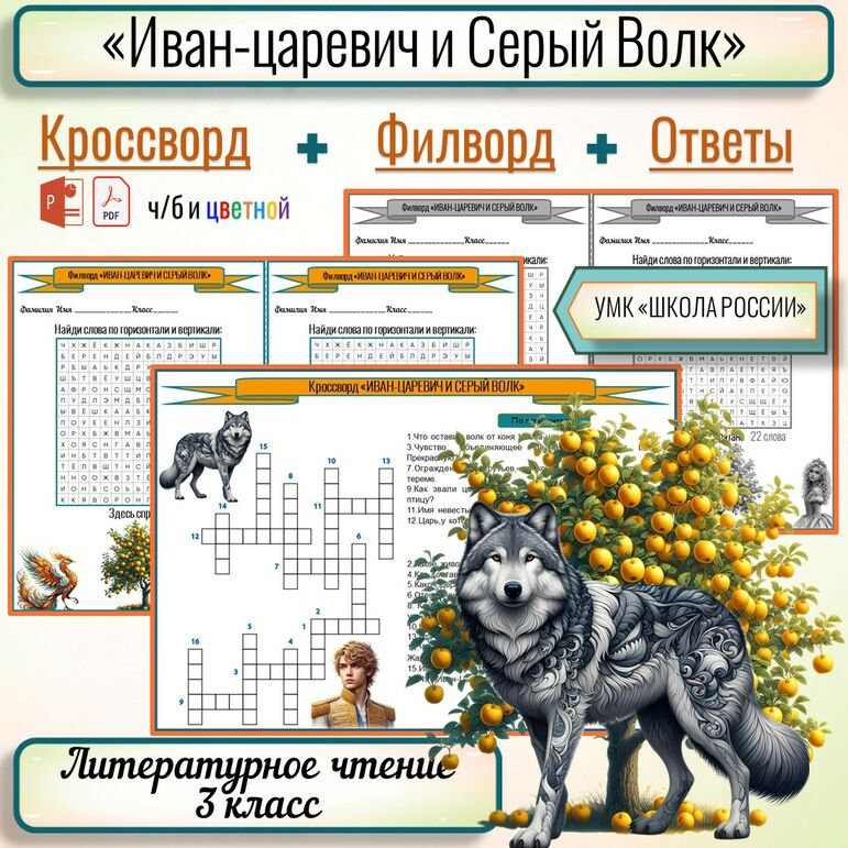 "Иван-царевич и Серый Волк" Кроссворд + Филворд + Ответы. 3 класс. Литературное чтение. Русская народная сказка. МОЖНО РЕДАКТИРОВАТЬ✨ Формат pdf и формат pptx ( с возможностью редактирования файла) ДВА ФАЙЛА ДЛЯ ПЕЧАТИ НА ВАШ ВЫБОР : ЦВЕТНОЙ И ЧЕРНО-БЕЛЫЙ. Ознакомиться можно Здесь